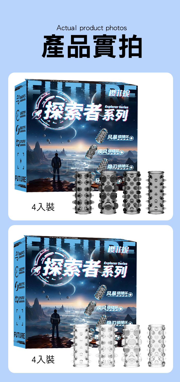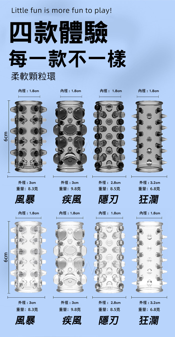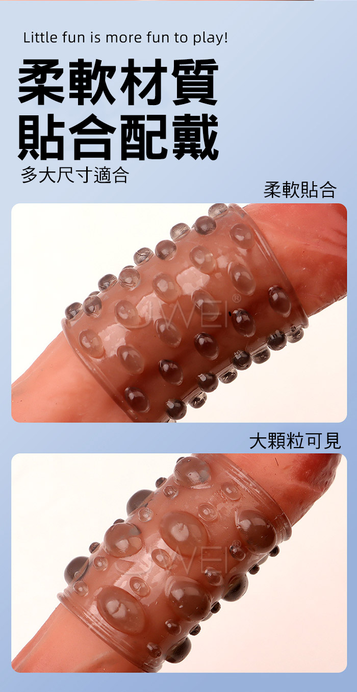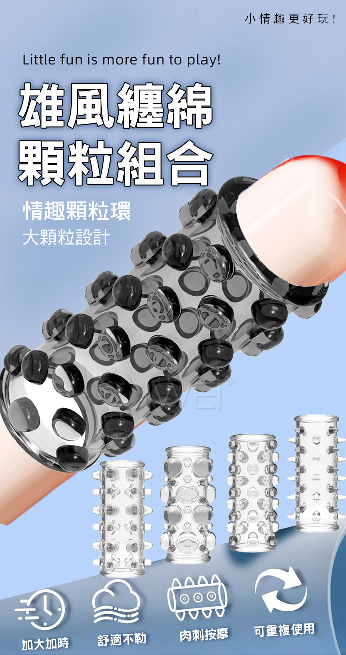 雄風纏綿露頭設計鎖精高潮環,鎖精、長時、加強,大顆粒柔軟材質,顆粒密集大狼牙套 直入深處波濤洶湧,漫漫長夜裡有她跟他一起是一種浪漫溫馨的時刻 這時候戴來一點不同,整個長夜餘韻悠長,帶她進入新的領域遨遊! ■材質:TPE ■功能:加粗變大,顆粒刺激,鎖精延時 ■內容:4入裝