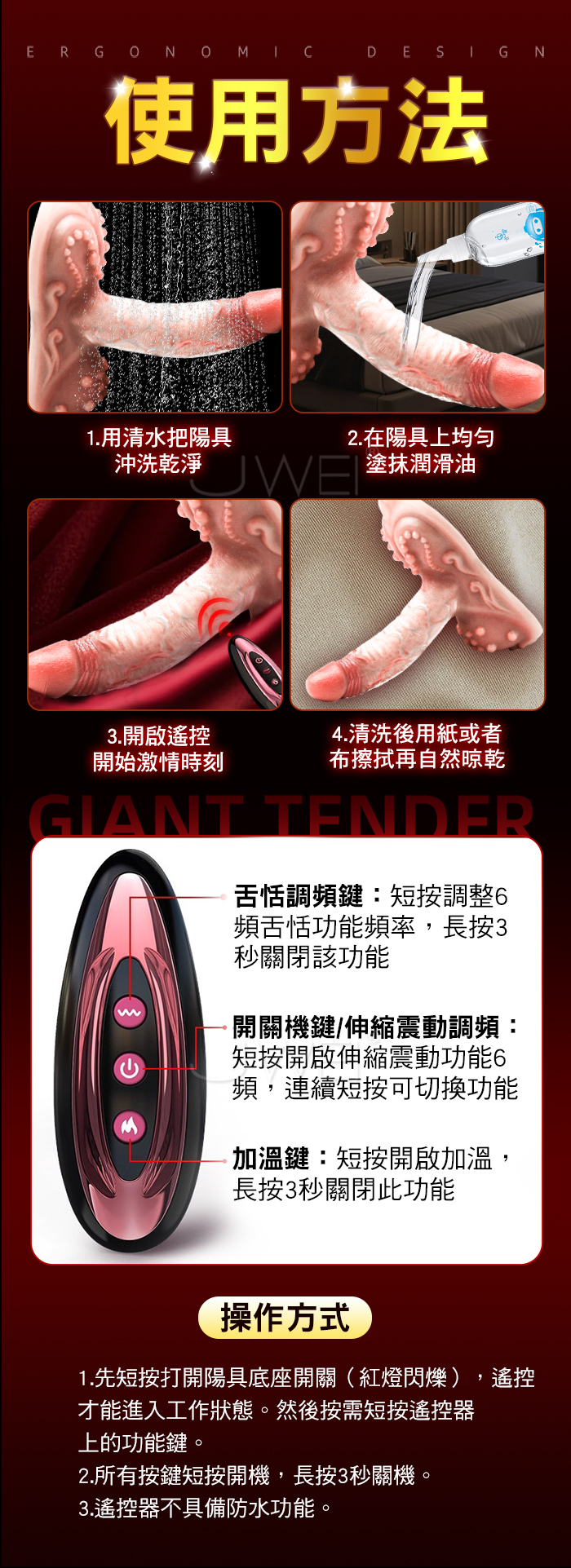 人體工學設計,全自動體感伸縮,專為亞洲女性設計,全新震動伸縮搖擺陽具 前戲生情,開發你的愉悅點,360度舒適你的歡樂點,夠大!夠粗!夠猛! 仿真復刻肉感,柔軟呵護私處,健康材質 放心嗨爽,可口含的液態矽膠! 飽滿龜頭仿真肌理,看得見的清晰紋理 摸得著的青筋褶皺 ■尺寸:大小詳如圖片標示 ■材質:液態矽膠+ABS ■特點: 6頻震動、6頻伸縮、無線遙控、加溫