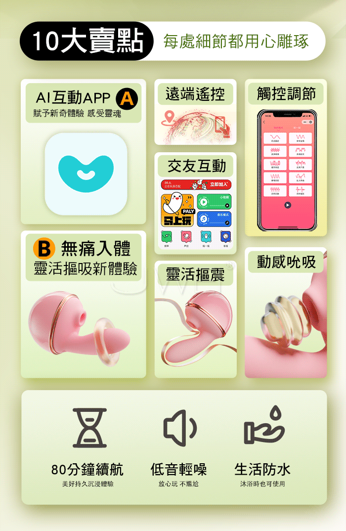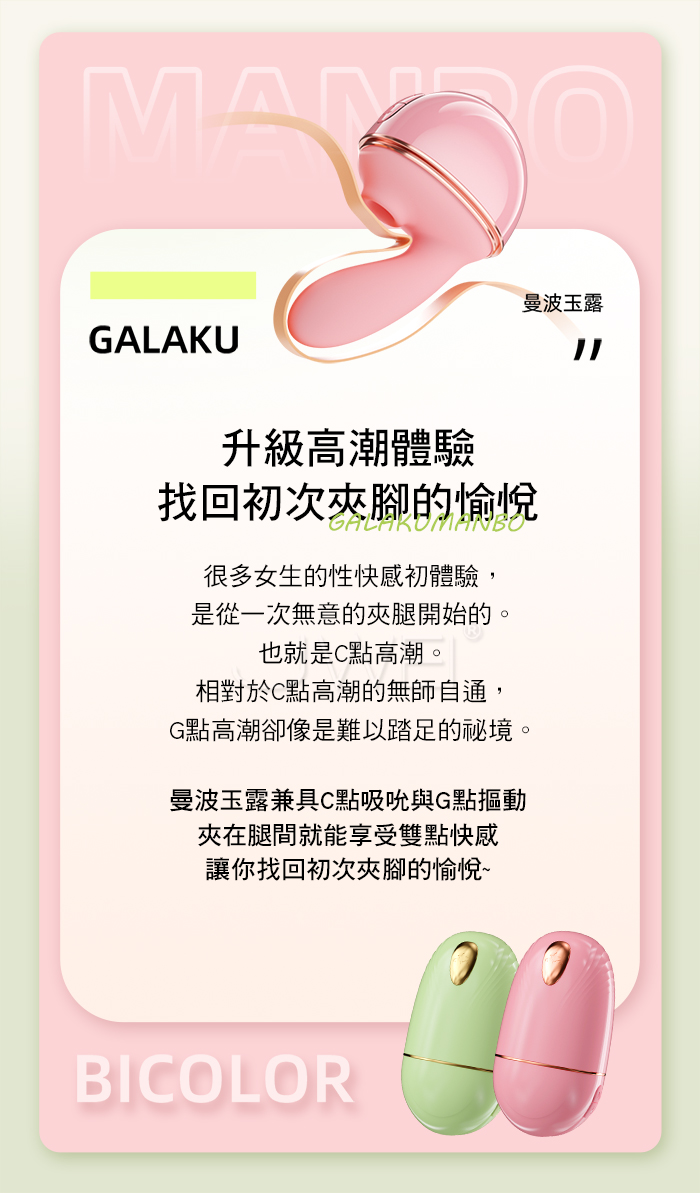 ►您現在的位置:首頁>GALAKU.曼波玉露 10頻靈指摳動+大口吮吸 雙潮喚起智能遠控變頻跳蛋【綠色】