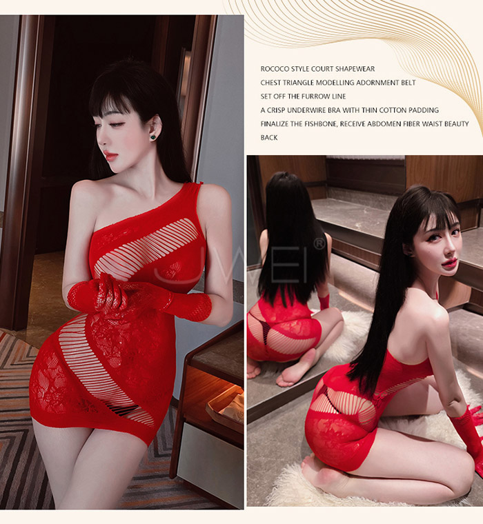 | 魅惑乳香.斜肩鏤空露乳半遮蜜桃包臀網衣-紅色【單件網衣+紅色網眼手套】