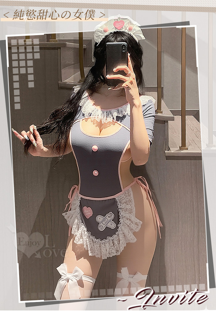 | 女僕角色扮演服|滾邊蕾絲・兩側挖空・翹臀剪裁開襠連身衣三件組