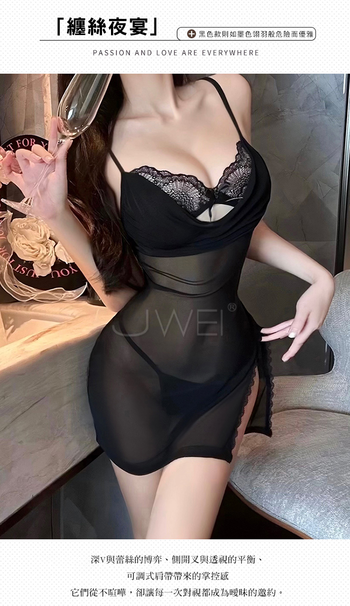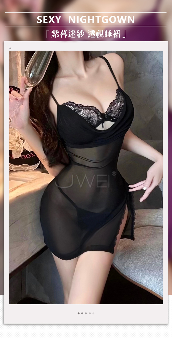 | 月暮迷紗.性感裸紗蕩領透視側開衩細肩帶美背睡裙【睡裙+T褲-黑色】