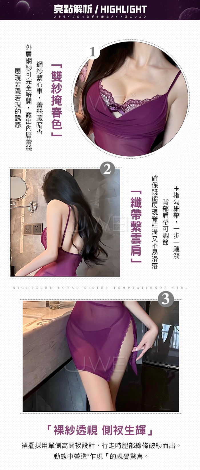 | 月暮迷紗.性感裸紗蕩領透視側開衩細肩帶美背睡裙【睡裙+T褲-紫色】