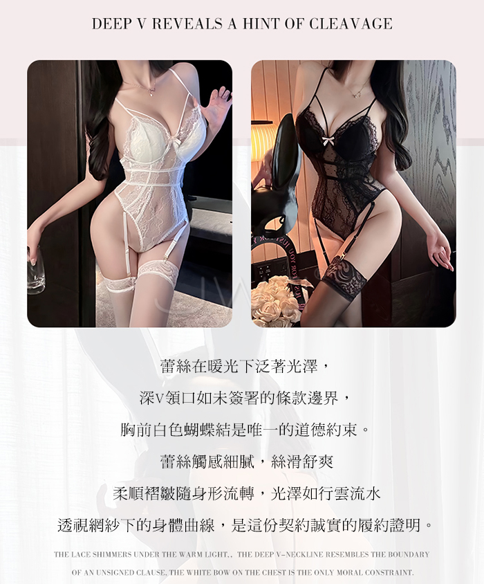 | 晝夜甜誘.蕾絲深V領口透視網紗暗扣開襠吊襪帶馬甲【白色】