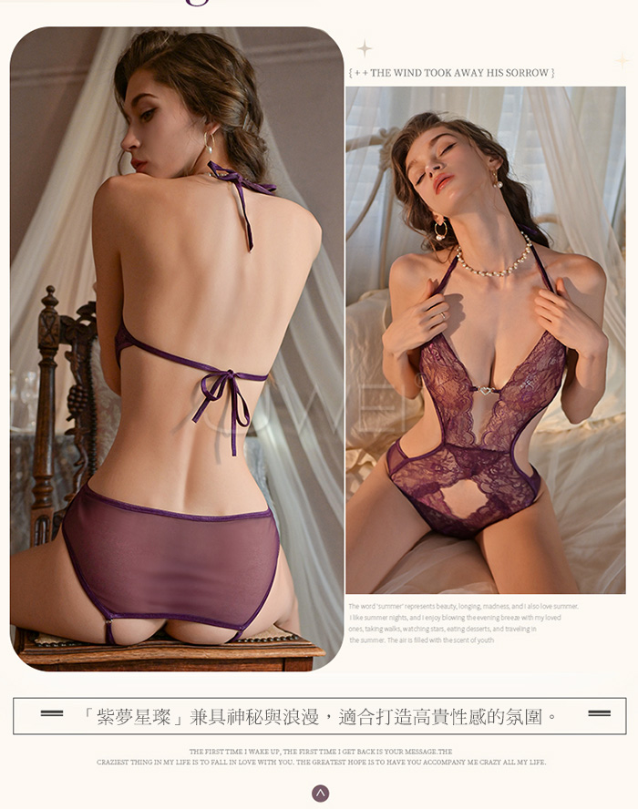 繁花似錦.深V愛心鑽飾露胸掛脖繫帶美背蕾絲開襠連體衣【紫色】
