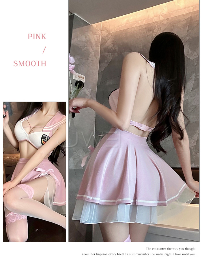 甜心刑警.胸前交叉繫帶清純百褶透視白紗COS制服套裝【上衣+短裙-粉+白】