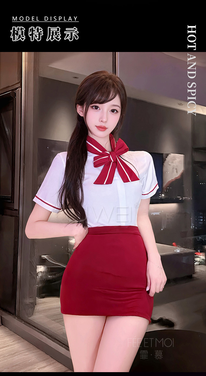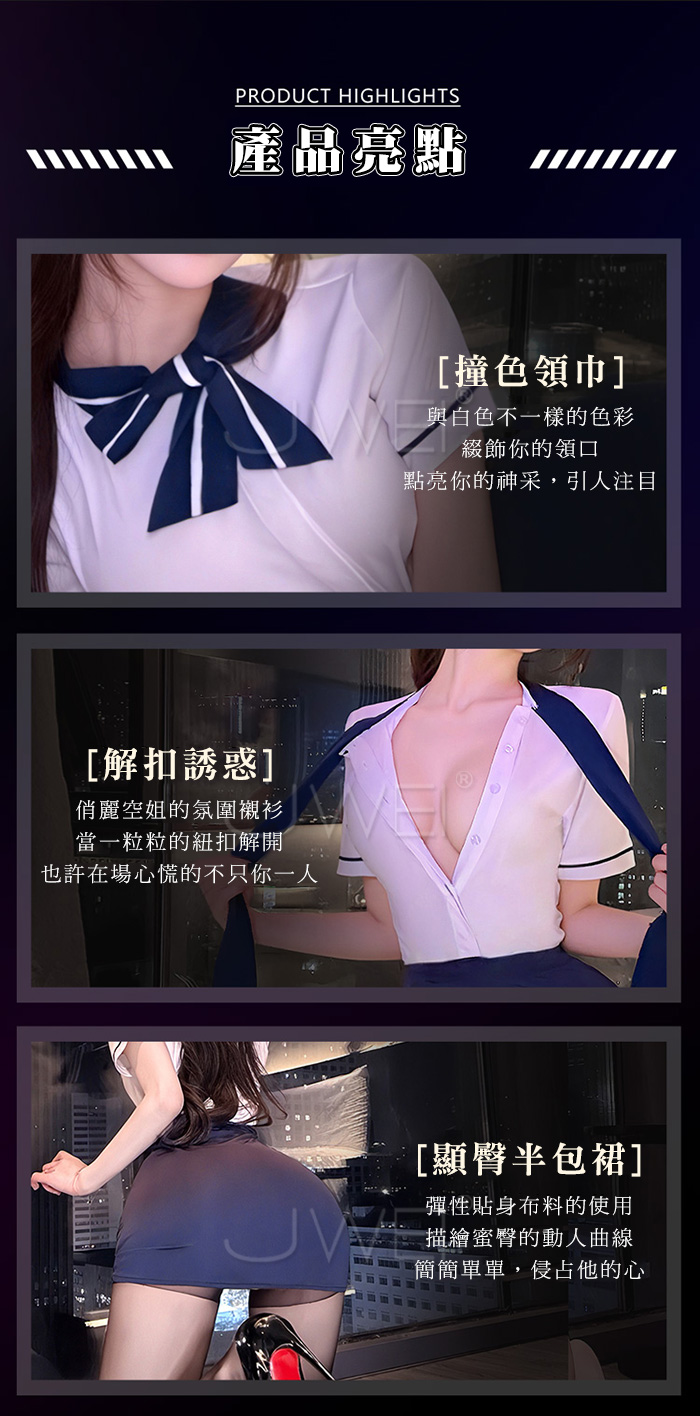 ►您現在的位置:首頁>雲端心機.解扣露溝誘惑修身貼合顯臀禁慾空姐套裝【上衣+裙子+T褲-藍】