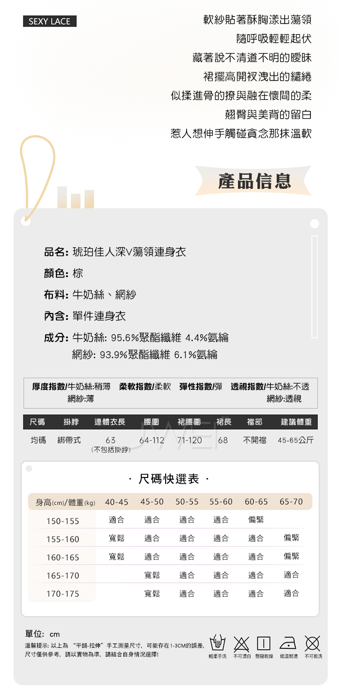 ■內容物:單件連身衣 ■適穿尺寸:FREESIZE ■材質:牛奶絲、網紗 ■彈性:彈 ■未撐開平量尺寸正負誤差1~2cm,1吋=2.54cm ■注意事項:基於保障消費者個人衛生,此貼身衣物恕不接受退換貨。 (如為商品本身暇疵,接受七日內換貨,請勿試穿,謝謝您)