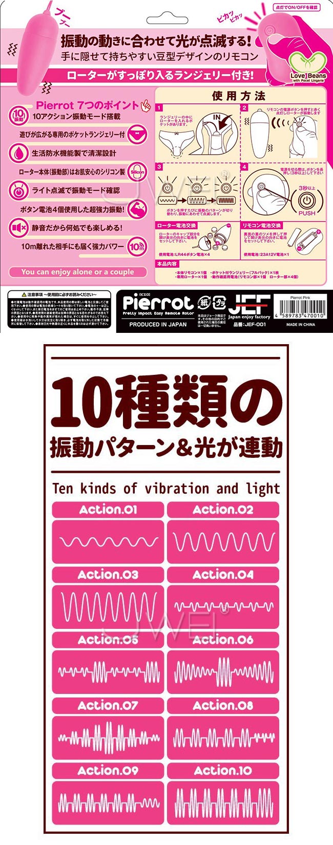 可愛くて、強力で、扱いやすい、パーフェクトリモコンローター「Pierrot ピエロ パーフェクトリモコンローター ピンク」です!手に持ちやすいリモコンは操作性抜群で、ボタン一つで簡単操作できちゃう♪電源オンオフはライトの点灯でお知らせ、さらに振動パターンも点滅で分かる仕様になっており、電波範囲は10mの強力パワー!ローターは肌に安心のシリコン製で、10モードの多彩なアクションを搭載しており、大きさも6cmとジャストサイズ!さらに生活防水機能付きなので水洗いも可能です♪遊びの幅が広がる専用のポケット付きランジェリーがセットになってます。(※ピンクのランジェリーはフルバックです。)