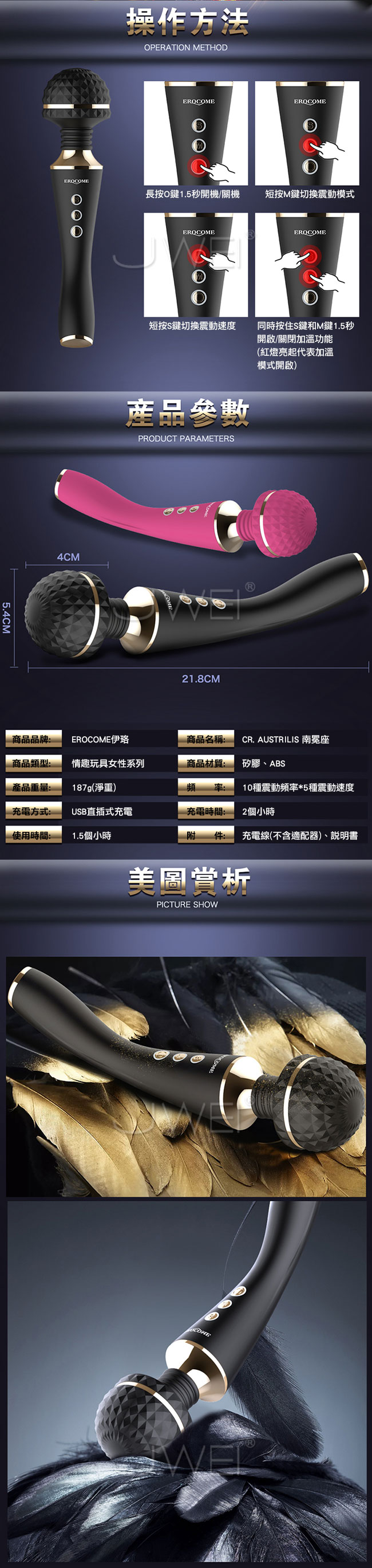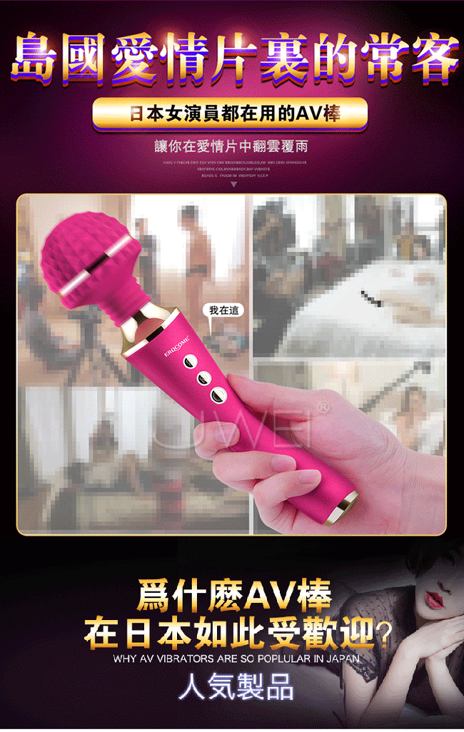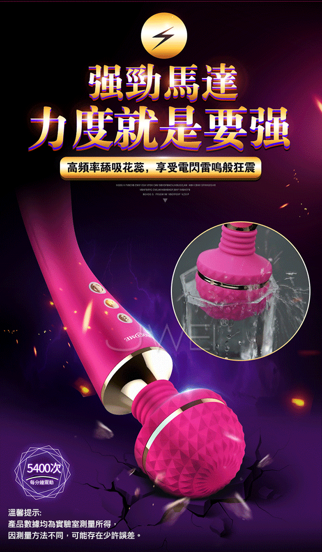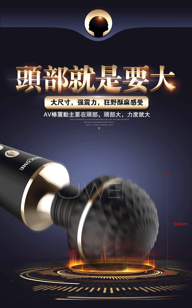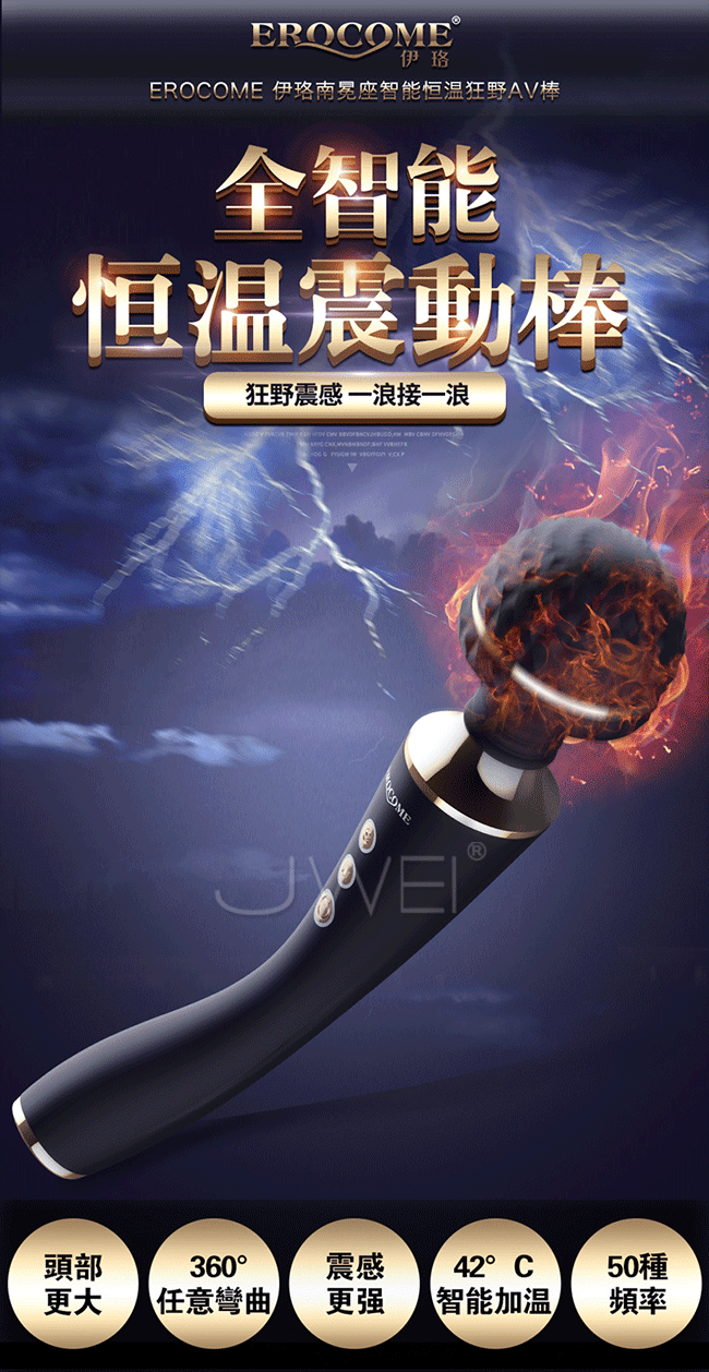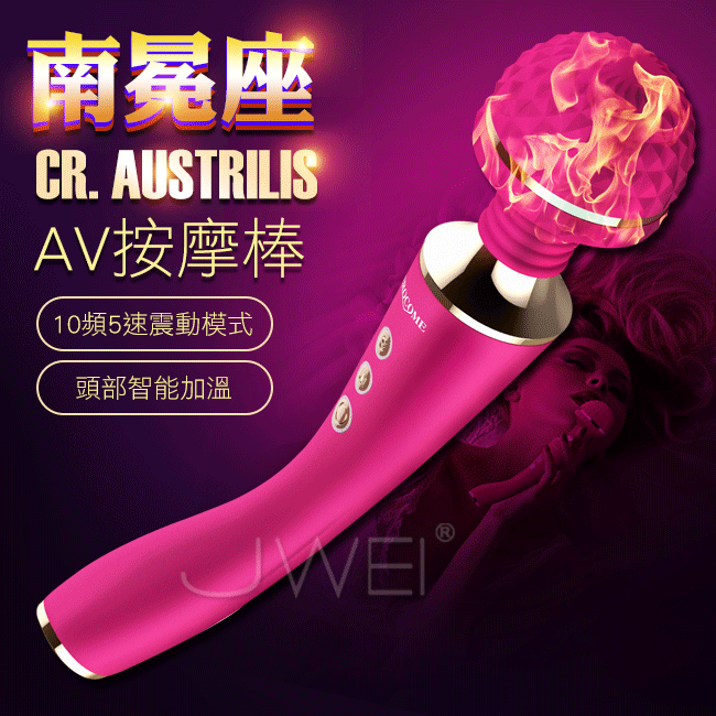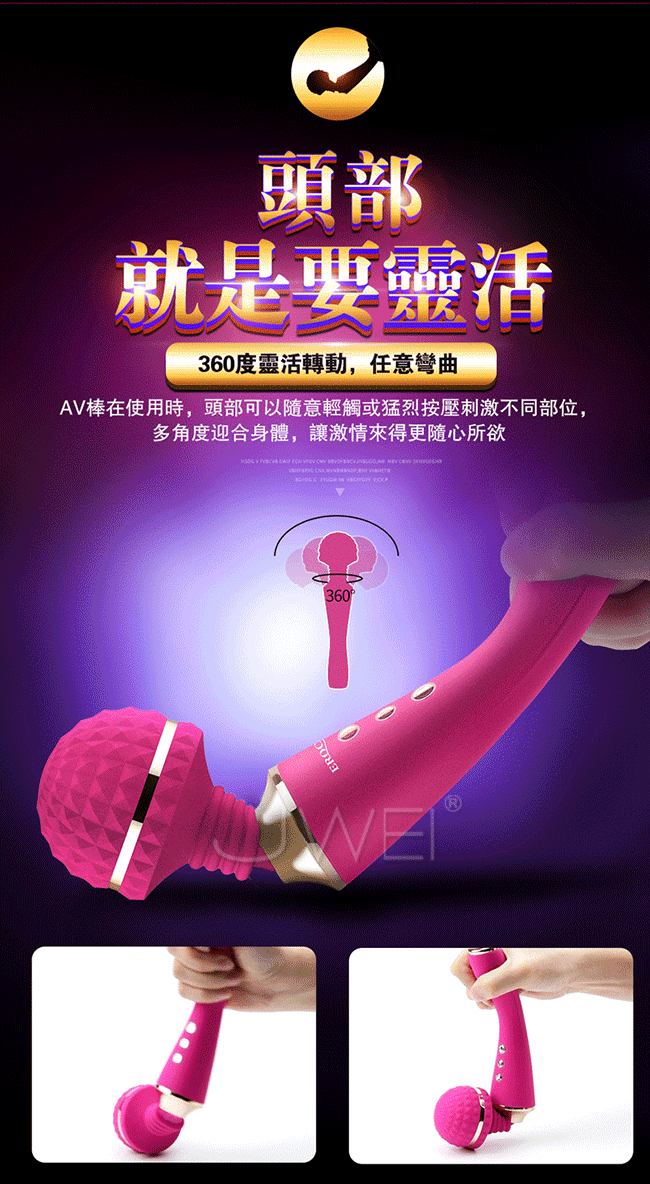 全智能恆溫AV棒超大頭部,大尺寸,強震力,給您狂野酥麻感受。頭部可隨意輕觸或猛烈按壓刺激不同部位,360度靈活轉動任意彎曲,多角度迎合身體讓激情來的更隨心所欲。頭部擁有智能加溫給您如男人般暖暖的愛,還擁有10種震動模式及5種脈衝強度帶給您50種高潮體驗喔!採用柔軟親膚矽膠柔軟無異味,頭部的菱形凸點可增加刺激感~採USB充電快速便捷,讓您縱享激情時刻,還擁有防水靜音功能讓您盡情享受魚水之歡。