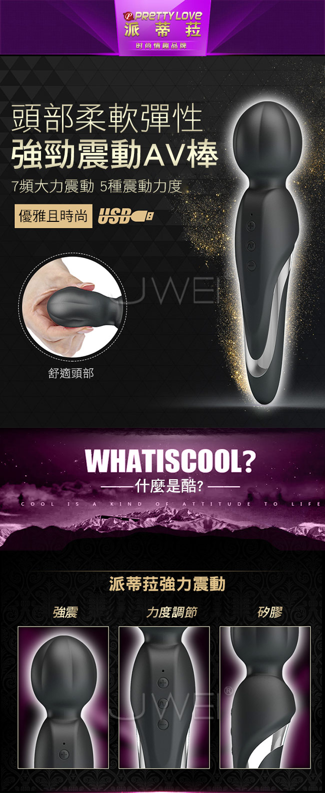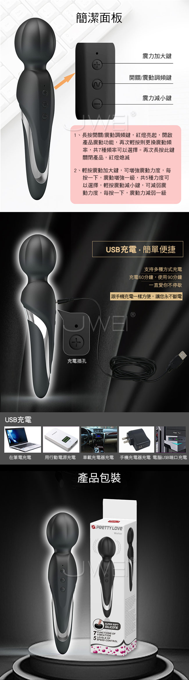 ►您現在的位置:首頁>Pretty Love.Walter 柔軟情慾 5檔7頻防水AV按摩棒-黑色