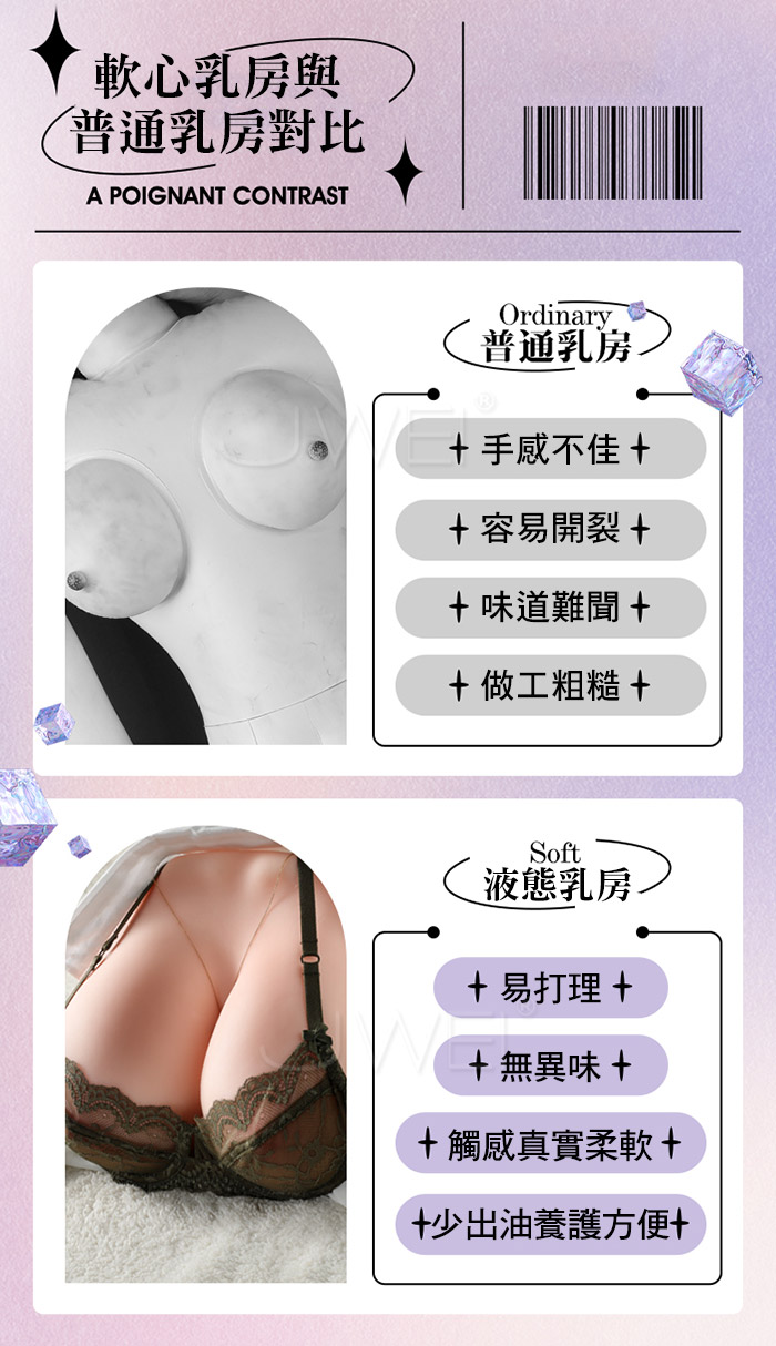 真人G奶復刻,圓潤大奶真人乳暈,胸部皮紋,看得見的舒適體驗,細膩皮膚紋 理;玲瓏佳人,波濤洶湧,綿軟抖動,感受一浪接一浪的波推感;逼真私處,真 實通道還原,逼真造型復刻,入口圈環包裹,深處蠕動,仿真通道,三種玩法一 次擁有,激情三交,酥胸、後庭、私處,多樣體驗!