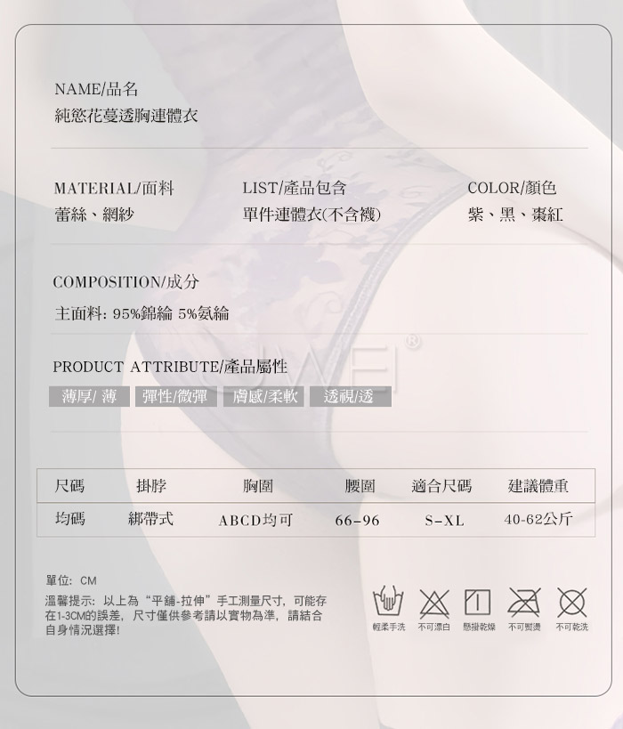■內容物:單件連體衣 ■適穿尺寸:FREESIZE ■彈性:微彈 ■未撐開平量尺寸正負誤差1~2cm,1吋=2.54cm ■注意事項:基於保障消費者個人衛生,此貼身衣物恕不接受退換貨。 (如為商品本身暇疵,接受七日內換貨,請勿試穿,謝謝您)