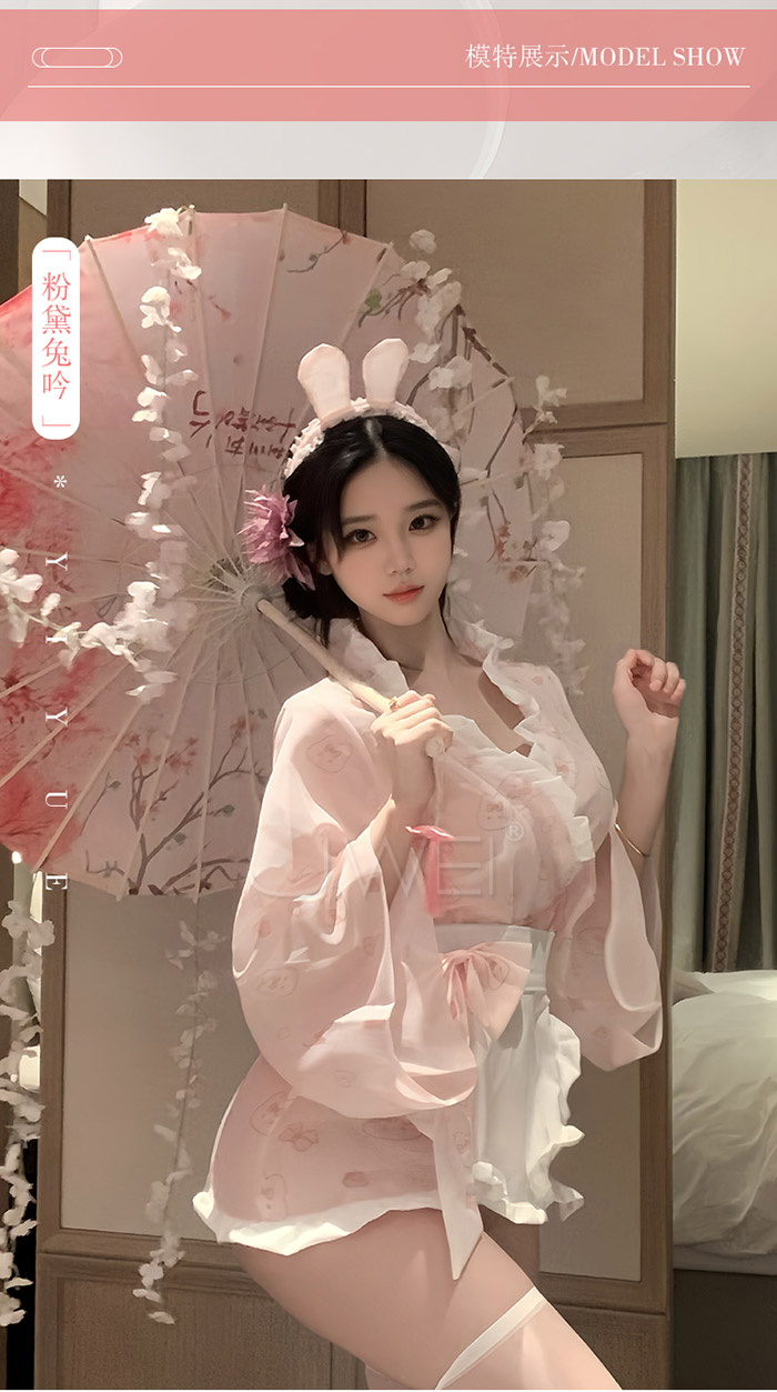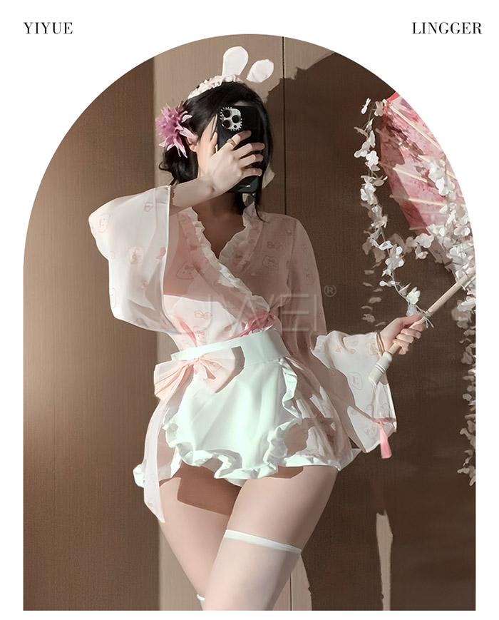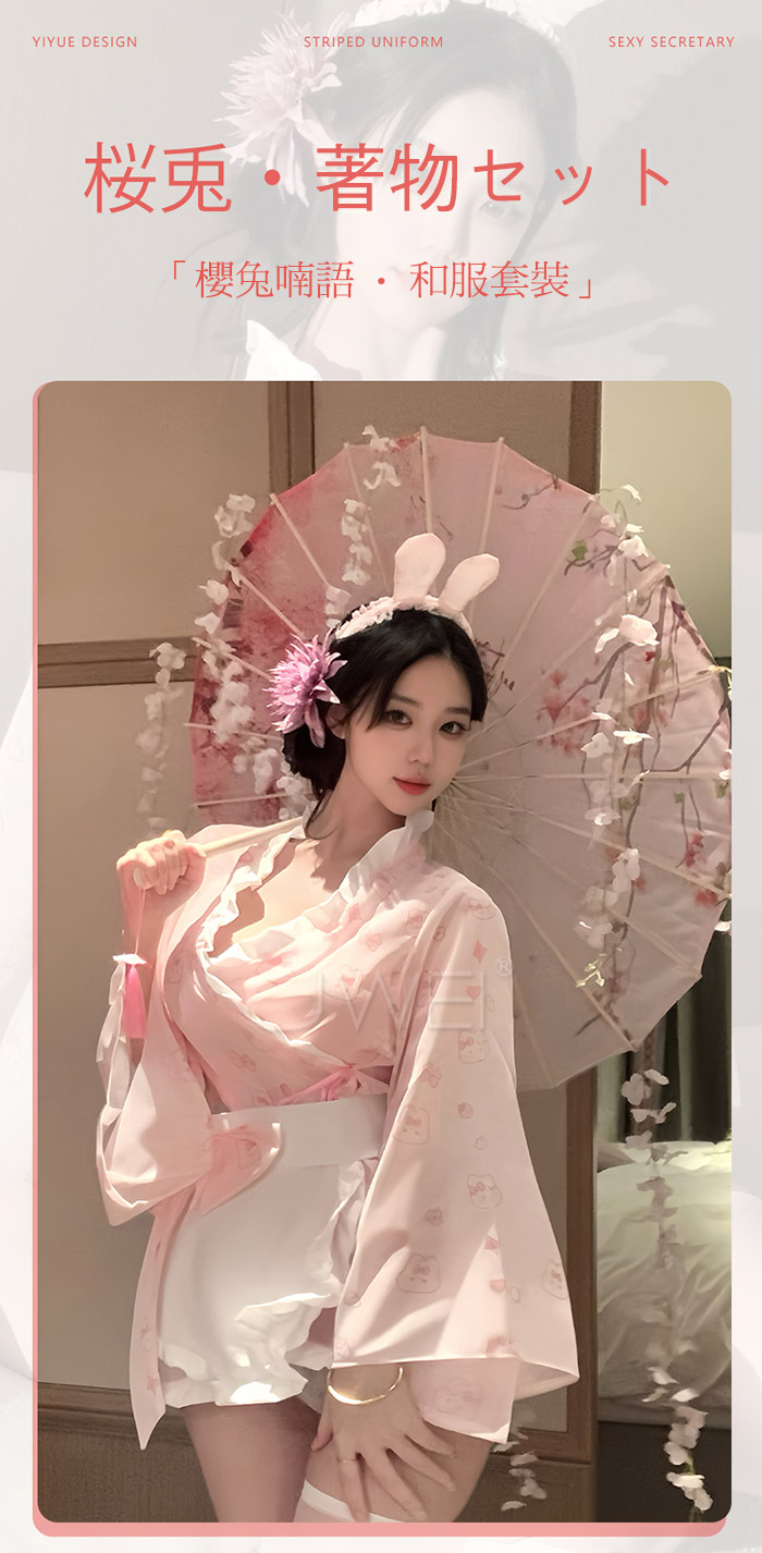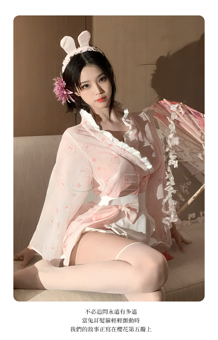 ►您現在的位置:首頁>櫻兔喃語.糯糯小兔嘰薄紗開襟印花日式和服套裝【髮箍+和服+圍裙+T褲】