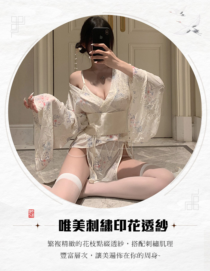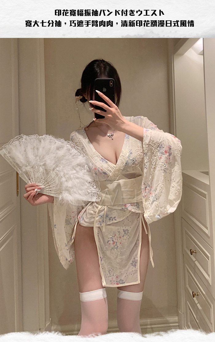 | 春日櫻花.風情開襟露胸微透日式和服套裝-淡黃色【外套+胸罩+T褲+腰封+分片裙*2】
