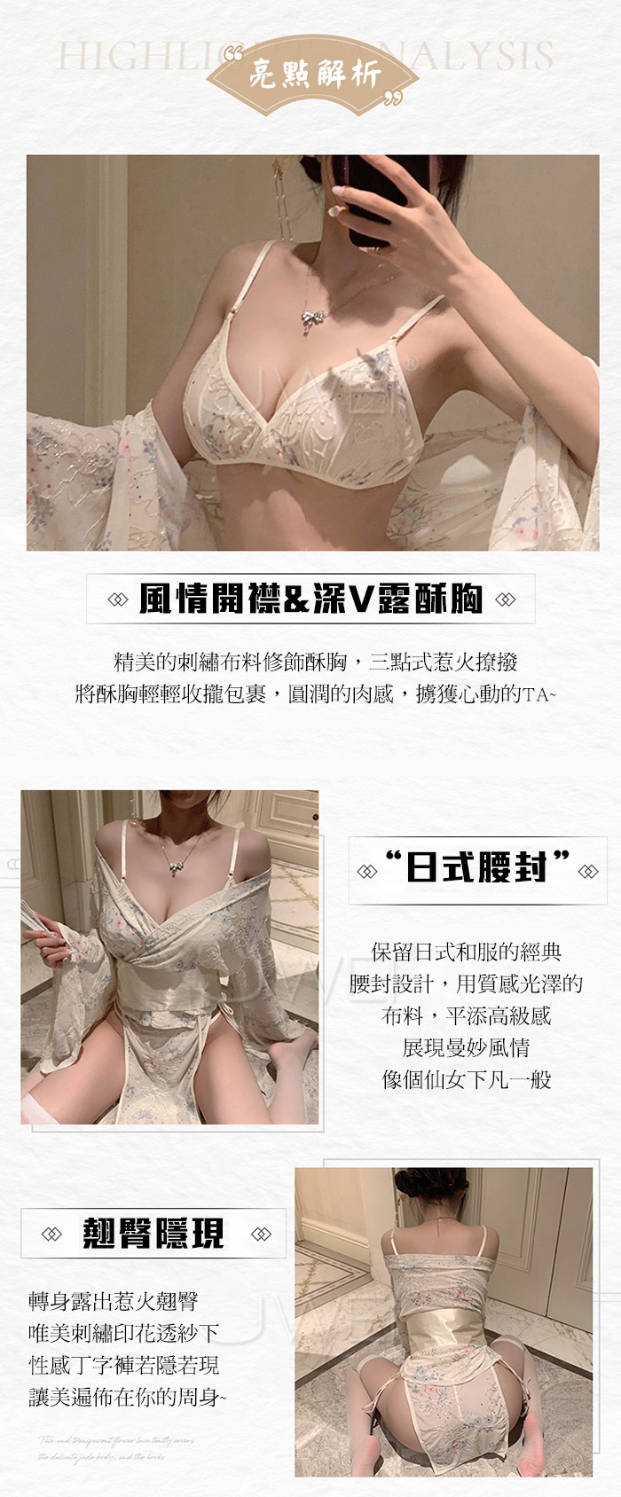 ►您現在的位置:首頁>春日櫻花.風情開襟露胸微透日式和服套裝-淡黃色【外套+胸罩+T褲+腰封+分片裙*2】