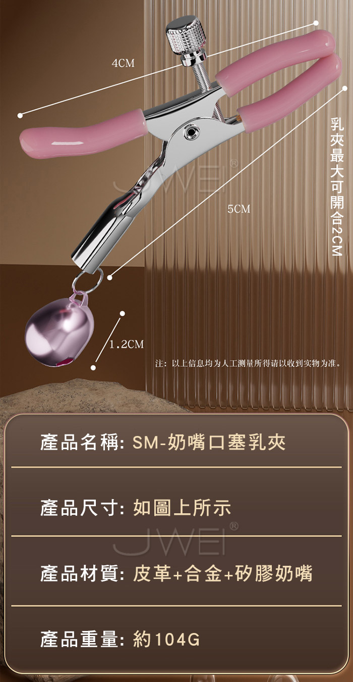 情侶玩具 羞恥調教 奶嘴口塞乳夾 口水流垂 奶嘴設計矽膠材質的奶嘴Q彈耐用軟萌可愛 乳夾鈴鐺隨著身體擺動而循序漸進,乳此動聽 產品規格 ■尺寸:大小詳如圖片標示 ■材質:皮革+合金+矽奶嘴 ■特色:增進情趣 ■SM用品屬於特殊情趣用品,需在雙方清醒自願的情況下使用,該物品僅作為情趣用品使用,使用時應注意安全!!