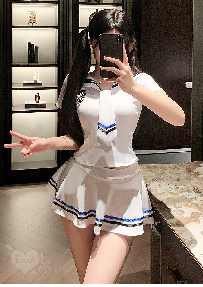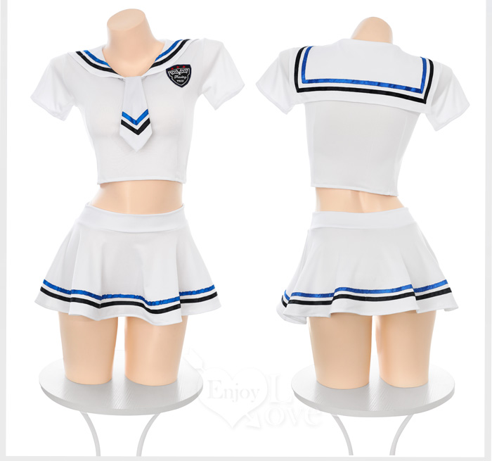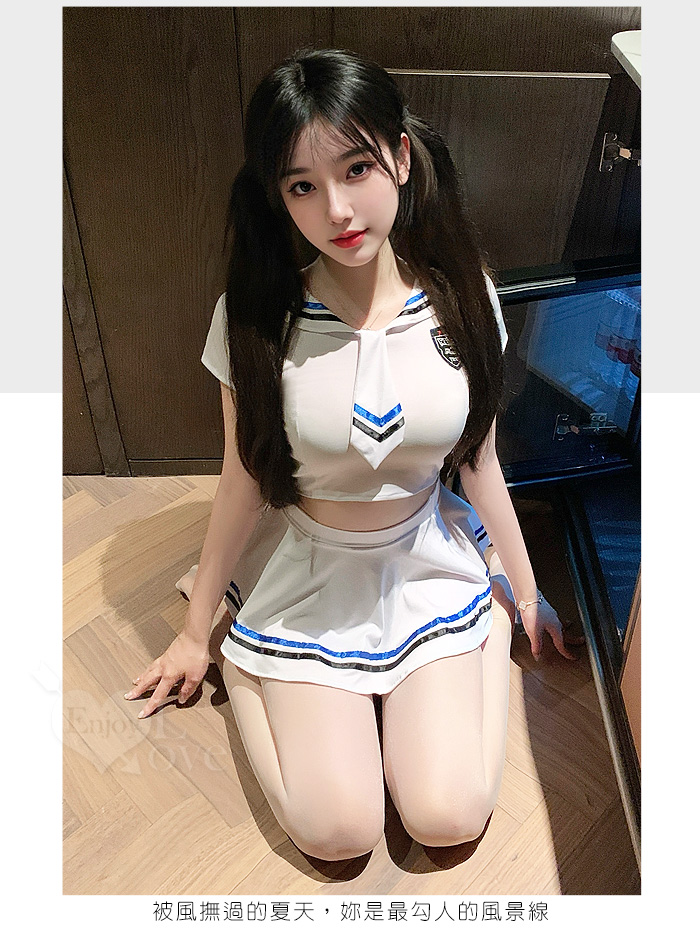 學生角色扮演服!純白大方水手領露腰短版上衣 × 條紋短裙三件組